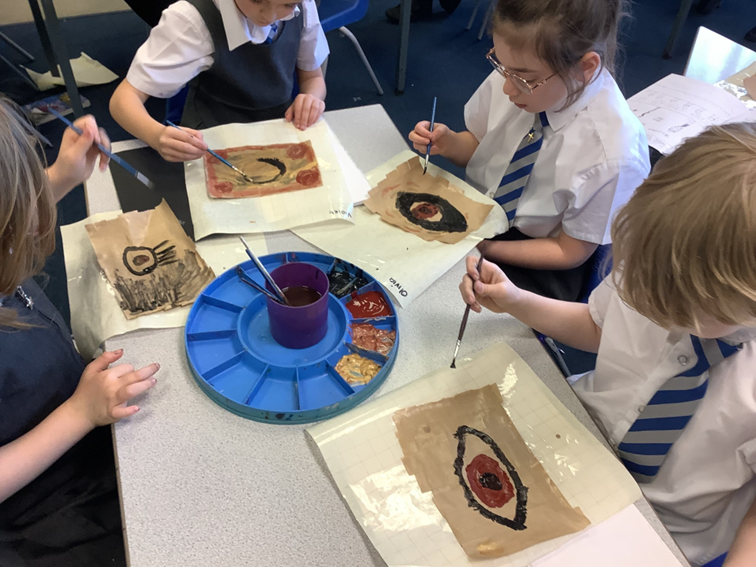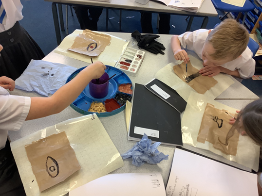 In our Egyptian art topic, we created Egyptian scrolls by making our own papyrus paper and following a design–make–evaluate process. First, we designed our scrolls by planning traditional Egyptian patterns and symbols. Then we made the papyrus using layered strips and carefully added our designs using appropriate colours and shapes. Finally, we evaluated our finished scrolls by reflecting on what worked well and how closely our artwork matched authentic Egyptian art styles.